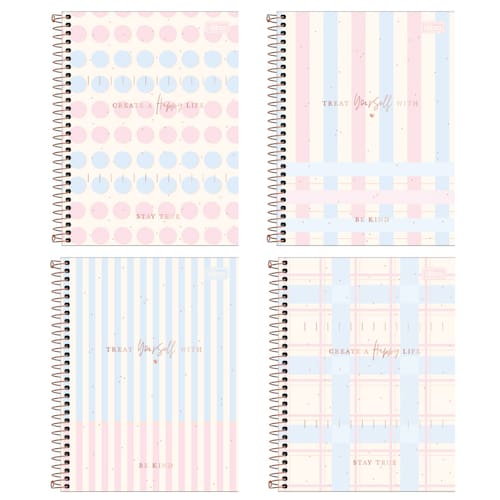 Possui 160 folhas divididas em 10 matérias, capa dura com detalhe metalizado, parte interna decorada, bolsa de papel decorada, folha com adesivos funcionais e folhas pautadas destacáveis.
