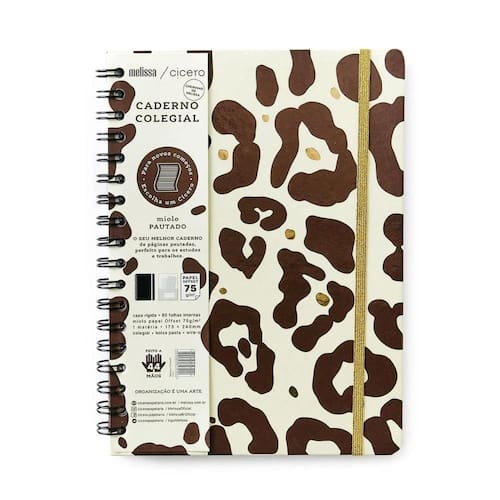 Características: - Marca: Cícero Papelaria - Modelo: Caderno Melissa Onça - Medidas aproximadas: 17cm x 24cm - Capa rígida - Possui bolsa interna em papel - Caderno com 01 matéria - Acabamento em Wire-o espiral