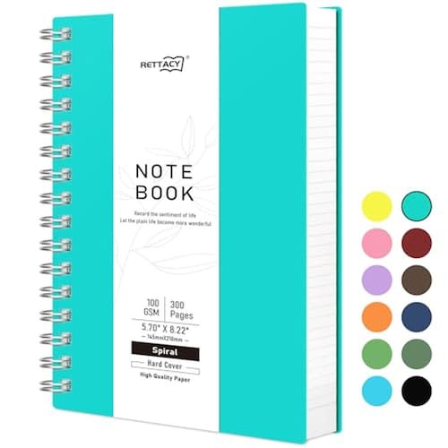 Caderno espiral RETTACY de 300 páginas — Caderno espiral A5 com 5,7" × 8,22", papel pautado universitário premium de 100 g/m2, encadernação de dois fios, caderno espiral de material escolar para mulheres e homens (azul tiff)