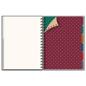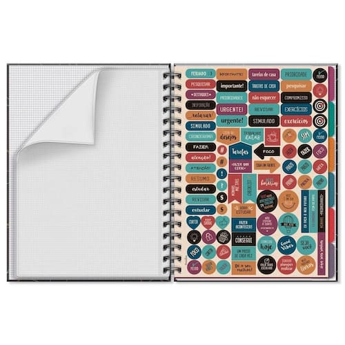 Caderno Folhas Removíveis Geométrico Fina Ideia: - Caderno capa dura com estampa exclusiva e frase em hot stamp dourado; - Formato 16,5x23,2cm; - Miolo pautado com 80 folhas removíveis em papel offset 90g/m; - 6 divisórias removíveis coloridas e estampadas em papel Kraft 200g/m; - Encadernação wire-o e elástico para fechamento; - Acompanha envelope para documentos resistente e folha de adesivos.