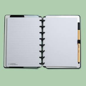 Caderno Inteligente A5 Pequeno Dark Blue - 80 Folhas Caderno Inteligente A5 Pequeno Dark Blue - 80 Folhas A5 Pequeno: Capa e contracapa rígidas, 01 bolsa plástica, 01 folha de instrução de uso e manuseio, com refis e acessórios da marca disponíveis no verso, 01 folha de identificação com calendário no verso, 04 divisórias com abas para identificação 02 pretas e 02 transparentes , 80 folhas offset 90g 60 folhas pautadas e 20 folhas lisas brancas para impressão , 01 suporte com elástico para 01 caneta ou 01 lápis e discos M + elástico. tamanho: 25,5cm X 19cm