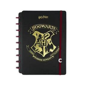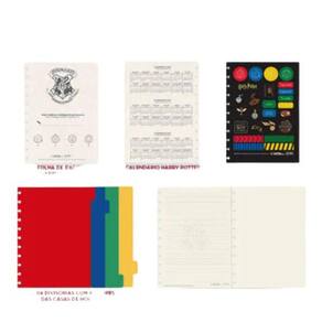 Com acabamento premium em hotstamping dourado, folhas off-white personalizadas, adesivos temáticos e divisórias nas cores das casas Grifinória, Sonserina, Corvinal e Lufa-Lufa. Detalhes: Capa e contracapa rígidas; 01 bolsa plástica; 01 folha de instrução de uso e manuseio, com refis e acessórios da marca disponíveis no verso; 01 folha de identificação OFF WHITE com calendário no verso; 04 divisórias com abas para identificação (01 vermelha, 01 amarela, 01 azul e 01 verde); 80 folhas offset 90g (60 folhas pautadas off white HARRY POTTER e 20 folhas lisas brancas para impressão); 01 suporte com elástico para 01 caneta ou 01 lápis. Discos M + elástico.
