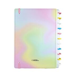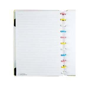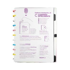 - Capa e contracapa rígidas; - 01 bolsa plástica; - 01 folha de instrução de uso e manuseio, com refis e acessórios da marca disponíveis no verso; - 01 folha de identificação com calendário no verso; - 04 divisórias com abas para identificação (02 pretas e 02 transparentes); - 80 folhas offset 90g (60 folhas pautadas e 20 folhas lisas brancas para impressão); - 01 suporte com elástico para 01 caneta ou 01 lápis; - Discos M + elástico.