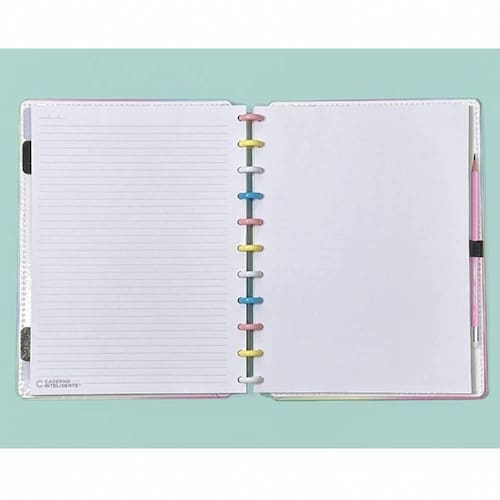 Grande: Capa e contracapa rígidas, 01 bolsa plástica, 01 folha de instrução de uso e manuseio, com refis e acessórios da marca disponíveis no verso, 01 folha de identificação com calendário no verso, 04 divisórias com abas para identificação 02 pretas e 02 transparentes , 80 folhas offset 90g 60 folhas pautadas e 20 folhas lisas brancas para impressão , 01 suporte com elástico para 01 caneta ou 01 lápis e discos M + elástico.