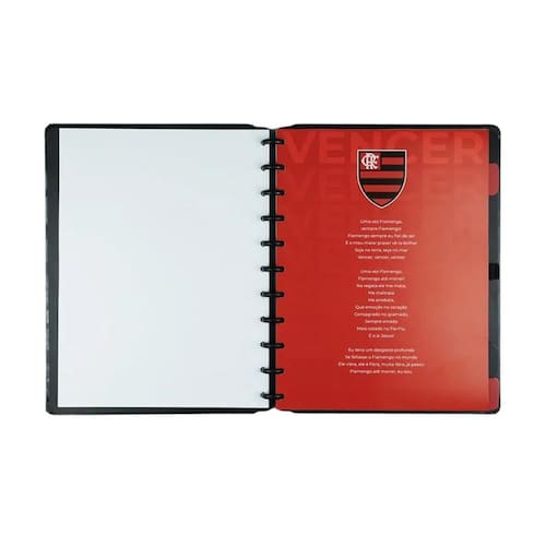 Caderno inteligente grande preto um caderno do oficial para você, torcedor do mengão, que procura uma solução premium em suas anotações, estudos e escrita. Nas suas cores favoritas, vermelho e preto, criado exclusivamente para a apaixonada torcida flamenguista: chegou o caderno inteligente rubro negro. Com capa exclusiva nas cores características do time e discos e elástico preto e vermelho, ele é o caderno do que você sempre sonhou em ter versátil e muito prático para qualquer necessidade de um flamenguista de coração. E tem mais: essa edição especial também vem com selo oficial, folha de adesivos, folhas exclusivas com hino, biografia e escalação, divisórias coloridas e folhas pautadas personalizadas oficiais do clube