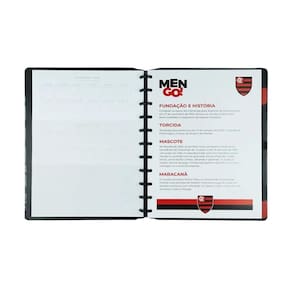 o que contém: capa e contracapa rígidas, 1 bolsa plástica, 1 folha de instrução de uso e manuseio, com refis e acessórios da marca disponíveis no verso, 1 folha de identificação com calendário no verso, 4 divisórias com abas para identificação 2 pretas e 2 vermelhas . 80 folhas offset 90g 60 folhas pautadas com logo do time e 20 folhas lisas brancas para impressão