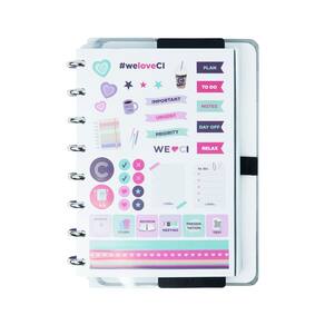 ? Inteligine: Capa e contracapa rígidas, 01 folha de adesivos, 01 folha de instrução de uso e manuseio, com refis e acessórios da marca disponíveis no verso, 01 folha de identificação com calendário no verso, 50 folhas Lisas Offset 120g e 01 suporte com elástico para 01 caneta ou 01 lápis.