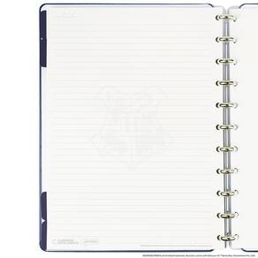 Características: - capa e contracapa rígidas, - 01 folha de adesivos personalizados, - 01 bolsa plástica, - 01 folha de instrução de uso e manuseio, com informações de refis e acessórios da marca disponíveis no verso, - 01 folha de identificação off white com calendário no verso, - 04 divisórias com abas para identificação azuis , - 80 folhas offset 90g 60 folhas pautadas off white harry potter e 20 folhas lisas brancas para impressão - 01 suporte com elástico para 01 caneta ou 01 lápis, - discos + elástico.