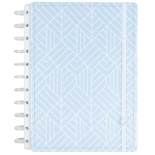 O que vem no produto: capa e contracapa rígidas na cor Ice Blue com sistema de 11 discos G (capacidade para até 150 folhas); 140 folhas offset 90g/m² (120 pautadas e 20 lisas); 10 divisórias com abas e página de índice; 1 folha de adesivos e 1 bolsa plástica; folha de identificação com calendário no verso; folha de instruções e dicas de acessórios; suporte elástico para 1 caneta ou lápis.
