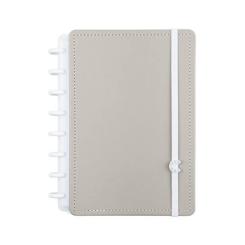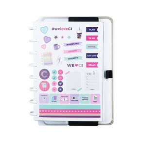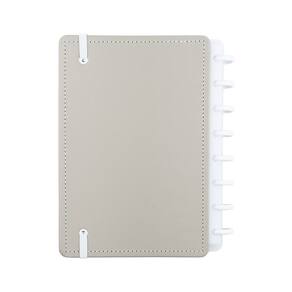 -A5, Médio ou Grande: Capa e contracapa rígidas, 01 folha de adesivos, 01 bolsa plástica, 01 folha de instrução de uso e manuseio, com refis e acessórios da marca disponíveis no verso, 01 folha de identificação com calendário no verso, 04 divisórias com abas para identificação, 80 folhas offset 90g (60 folhas pautadas e 20 folhas lisas brancas para impressão), 01 suporte com elástico para 01 caneta ou 01 lápis e discos M + elástico.