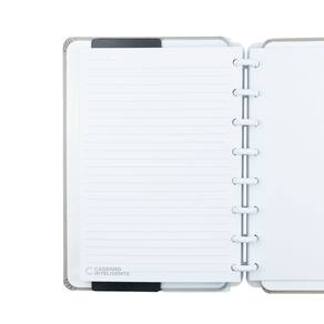 -Inteligine: Capa e contracapa rígidas, 01 folha de adesivos, 01 folha de instrução de uso e manuseio, com refis e acessórios da marca disponíveis no verso, 01 folha de identificação com calendário no verso, 50 folhas Lisas Offset 120g e 01 suporte com elástico para 01 caneta ou 01 lápis.