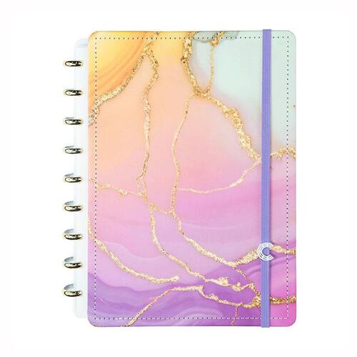 O Caderno Aurora é uma explosão de cores suaves, combinando tons de rosa, amarelo, roxo e verde clarinho, que se assemelham a um elegante mármore. Detalhes em dourado adicionam um toque de sofisticação, elevando a experiência de uso.