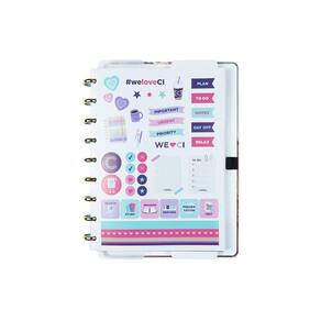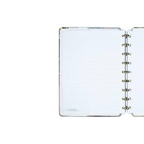 O modelo possui capa e contracapa rígidas, com impressão em alta qualidade e aplicação de verniz localizado na capa, discos metalizados na cor dourado com o centro transparente e elástico para fechamento na cor marrom com nosso característico C.