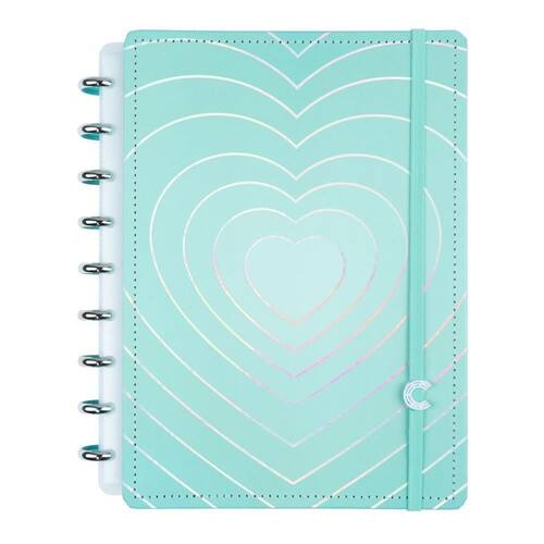 Apaixone-se e inspire-se com este caderno incrivelmente personalizavel turquesa com um brilho super sofisticado em formato de coracao com hotstamping holografico.