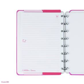 Características: - capa e contracapa rígidas, - 01 folha de adesivos, - 01 bolsa plástica, - 01 folha de instrução de uso e manuseio, com informações de refis e acessórios da marca disponíveis no verso, - 01 folha de identificação com calendário no verso, - 04 divisórias com abas para identificação 02 rosa choque e 02 rosa claro , - 80 folhas offset 90g 60 folhas pautadas e 20 folhas lisas brancas para impressão - 01 suporte com elástico para 01 caneta ou 01 lápis.