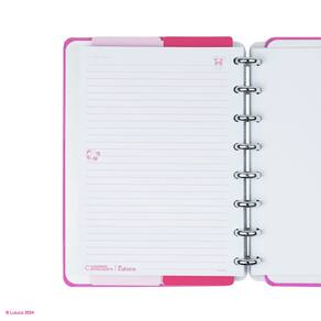 • A5 e Médio: Capa e contracapa rígidas, 01 folha de adesivos, 01 bolsa plástica, 01 folha de instrução de uso e manuseio, com refis e acessórios da marca disponíveis no verso, 01 folha de identificação com calendário no verso, 04 divisórias com abas na parte superior e inferior para identificação, 80 folhas offset 90g (60 folhas pautadas e 20 folhas lisas brancas para impressão), 01 suporte com elástico para 01 caneta ou 01 lápis e discos M + elástico.