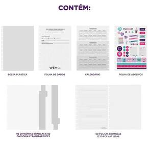 Acessórios inclusos: 1 bolsa plástica, 1 folha de adesivos, 4 divisórias com abas, 1 suporte elástico para caneta ou lápis