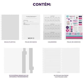 Acompanha bolsa plástica, folha de adesivos, divisórias com abas e suporte elástico para caneta.