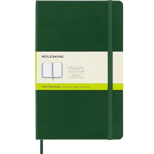 Moleskine Caderno clássico, capa dura, grande (12,7 cm x 21 cm), liso/branco, verde murta, 240 páginas - Caderno clássico Moleskine: os cadernos clássicos da Moleskine são cadernos perfeitos para escrever diários, um diário ou tomar notas em aulas ou reuniões da faculdade. Os cadernos Moleskine são amados por viajantes e jornalistas por seu design fino. - Capa durável e fecho elástico: mantenha projetos de escrita e notas em seu caderno Moleskine com uma faixa de fecho elástico e pastas de armazenamento internas. Capa Moleskine clássica semelhante a couro e páginas grossas de papel marfim são perfeitas para escrever com canetas-tinteiro. - Cadernos de qualidade para presente: agendas, diários e cadernos Moleskine vêm em capa dura ou capa mole e cores como preto, vermelho, azul, verde e marrom. A encadernação e a capa têm um acabamento durável, projetadas para diário, escrita e esboço. - Páginas de qualidade de luxo: as páginas grossas de papel marfim da Moleskine em um caderno Moleskine de capa dura, caderno Moleskine de capa mole, diário cahier ou volant ou agenda Moleskine são perfeitamente texturizadas para escrever com uma caneta esferográfica, caneta-tinteiro ou lápis. - MOLESKINE É amado por um motivo: escritores, estudantes, artistas, profissionais e viajantes adoram cadernos e planejadores da Moleskine De pautado a sem forro, pontilhado a papel milimetrado, há um caderno Moleskine para suas necessidades. Experimente um e você entenderá a paixão.