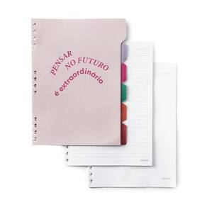 Este modelo possui: -bolsa pasta -cartela de adesivos funcionais exclusiva do produto -6 divisórias com abas customizáveis -miolo duo offset 90g: 40 folhas pautadas + 40 folhas pontado - perfeito para exercitar os dois lados do cérebro, este miolo vem com folhas em offset em uma maior gramatura para melhor funcionalidade do sistema removível.