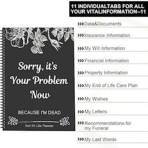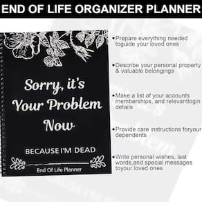 1 - ?O livro de exercícios do organizador do planejador de fim de vida?A pasta de trabalho organizadora do planejador de fim de vida é uma ferramenta bem-humorada de planejamento de fim de vida intitulada "Desculpe, o problema é seu agora porque eu estou morto. Esta edição engraçada do planejador de fim de vida ajuda você a organizar seus arranjos finais com um toque alegre - ?Organização abrangente?Este melhor organizador de fim de vida inclui seções para todas as suas informações importantes, tornando mais fácil para seus entes queridos encontrarem tudo o que precisam, incluindo arranjos financeiros, planos, distribuição de herança, etc., para que seus entes queridos possam obter ajuda quando ocorrerem eventos infelizes - ?Enchimento guiado?O fichário organizador de fim de vida útil é projetado para facilitar o uso, com seções claras e instruções para guiá-lo durante o processo. Este organizador de livros de vida é perfeito para quem quer colocar seus negócios em ordem - ?Durável e elegante?Com um design de caderno de capa dura, este livro de planejamento de fim de vida é durável e elegante. Os blocos de notas engraçados e os elementos engraçados dos cadernos adicionam um toque único, tornando-os uma ferramenta memorável e útil - ?Cuidados de fim de vida e desejos finais?Descreva claramente seus desejos de fim de vida, tomadores de decisão designados e quaisquer solicitações especiais que você tenha, garantindo que seus desejos sejam respeitados e seguidos
