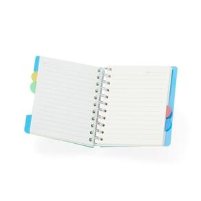 Caderno pequeno com 4 divisórias e abas para identificações, capa plástica com wire-o metálico. Contém aproximadamente 103 folhas marfins e folha inicial com tarjas para organizar e identificar as divisórias.