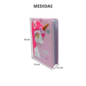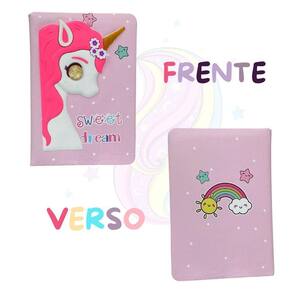 - Design Encantador: A capa macia é adornada com um desenho de unicórnio que conta com relevo delicado e glitter brilhante nos olhos, tornando-o uma obra de arte visual.