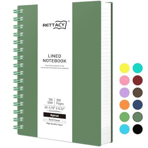 Caderno RETTACY College Ruled, caderno espiral de 300 páginas para trabalhar com 5,7" × 8,22", papel pautado universitário premium de 100 g/m2, encadernação de dois fios, caderno de material escolar para homens e mulheres (verde escuro)