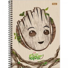 - O caderno vem com adesivo especial? Sim, o caderno vem com um adesivo especial relacionado ao personagem Groot.