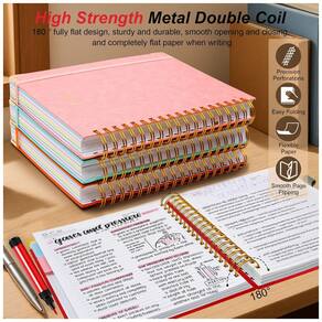 Este caderno universitário espiral GDGDSY em formato B5 8 x 10 oferece 5 seções organizadas em um único volume com 300 páginas pautadas, adequado para anotações extensas em estudos, trabalho e planejamento pessoal. A capa dura em couro sintético com cantos metálicos dourados reforçados protege o miolo contra desgaste diário e impactos leves na mochila ou pasta.