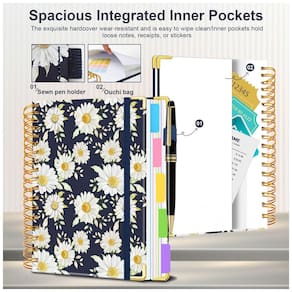 Este caderno universitário espiral HDhuiun em formato 8 x 10 reúne 300 páginas pautadas distribuídas em 5 seções, adequado para anotações em rotinas de estudo, trabalho e organização pessoal. A capa dura floral com estampa de margaridas brancas é resistente ao uso diário e pode ser limpa com facilidade.