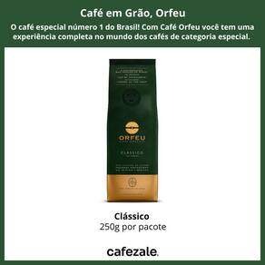 Orfeu Clássico é um café especial em grãos 100% Arábica, equilibrado e de torra média. Apresenta notas florais, frutadas e de caramelo. Possui doçura alta, acidez equilibrada, corpo aveludado e aromas complexos, com uma finalização persistente e prazerosa.