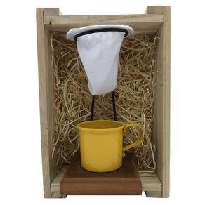 Esse kit é composto pela base madeira de demolição, coador de pano, 1 uma canequinha, uma caixa de madeira do tipo engradado.