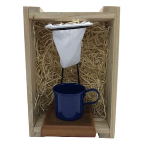 Um belo presente para quem gosta de café coado e quer bebe-lo quando tiver vontade. Esse kit é composto pela base madeira de demolição, coador de pano, 1 uma canequinha, uma caixa de madeira do tipo engradado.