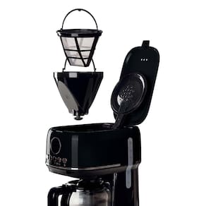 Cafeteira da Linha Moderna para preparar um delicioso café coado a qualquer hora do dia. Defina a distribuição do café através do visor LCD e espere que o café seja distribuído. Graças à base com aquecimento, seu café permanece quente até que você queira servi-lo. Com um único ciclo você pode servir até 15 xícaras de café graças à alta capacidade da jarra de vidro temperado. O nível da água é visível e os filtros são removíveis para garantir uma limpeza fácil e eficaz.