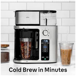 A cafeteira Braun MultiServe Plus KF9270SI prepara café quente, cold brew ou over ice em 7 tamanhos de infusão (xícara única até carafa de 10 copos), com seletor rotativo e configurações Gold ou Bold via painel touch e dial. Sistema ExactBrew ajusta fluxo de água, temperatura e velocidade automaticamente para consistência em cada preparo, completando carafa completa em menos de 8 minutos ou cold brew em 13 minutos. Indicada para uso doméstico sem cápsulas, suporta copo de viagem ou garrafa térmica diretamente.