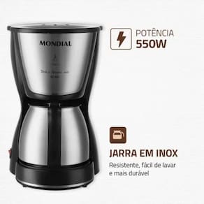 O design moderno com jarra em inox e filtro permanente tornará seu momento do café mais econômico e sustentável. Com sistema corta-pingos, indicador de água e tampa basculante, ela combina funcionalidade com durabilidade tudo com a garantia de 1 ano da Mondial.