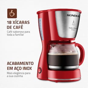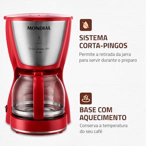 A Cafeteira Elétrica Mondial é ideal para quem gosta de muito café! Além disso, ela ligada consegue manter o líquido aquecido e você sempre terá um café fresquinho a qualquer momento! Com capacidade para 18 Xícaras, a cafeteira Mondial é bivolt, super resistente, leve e com capacidade de água para 900ml . Navegue em nossa linha completa de Cafeteiras e confira todos os modelos disponíveis em nosso site.