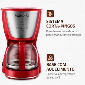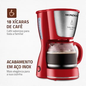Cafeteira Elétrica Dolce Arome Mondial Vermelho/Inox 550W 220V C-35 18X Comece seu dia com aroma e sabor! A Cafeteira Elétrica Mondial Dolce Arome C-30-18X tem capacidade para servir até 18 xícaras de café. Possui filtro permanente e porta-filtro removível que proporcionam mais sustentabilidade ao meio ambiente. Para conservar a temperatura, conta com jarra de vidro e base com aquecimento. Com design elegante e compacto, é ideal para valorizar o seu cantinho do café. Saiba mais sobre a Dolce Arome C-30-18X da Mondial: