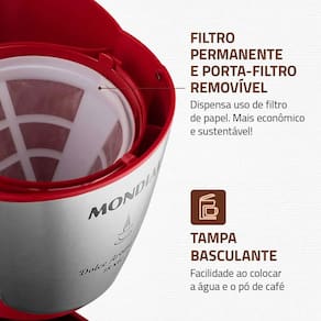 Filtro Permanente e porta filtro removível: A cafeteira é ecologicamente correta, pois dispensa a utilização do filtro de papel. O reaproveitamento do filtro proporciona mais economia e sustentabilidade.