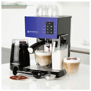 Inclui Bomba de café expresso de 19 barras, máquina de cappuccino e café com leite, moedor elétrico de grãos de café, porta filtro de aço inoxidável com cestos de filtro de dose única e dupla, reservatório de leite, colher, tamper, 2 copos de café expresso de parede dupla, 2 copos de cappuccino de parede dupla e 16 cappuccino Modelos de Estêncil Artístico Máquina de bomba de 19 barras fácil de usar com tudo o que precisa para se tornar um verdadeiro barista MÁQUINA LATTE COM BOM DE LEITE O bico removível embutido permite aquecer e espumar o leite para criar cappuccinos e lattes. TANQUE DE ÁGUA GRANDE Tanque de água grande destacável de 1,4 L com alça conveniente para permitir recargas sem problemas e fácil limpeza Duas cestas de porta filtro de aço inoxidável incluídas para a opção de puxar uma única ou uma dose dupla durante cada extração