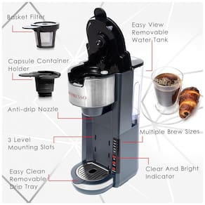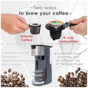 FUNÇÃO DE BREWING 2 Em 1 Nossa cafeteira de serviço único é exatamente o que você precisa para começar o dia de forma produtiva e em alta Escolha café moído ou cápsulas de xícara única. Nossa máquina de café pode preparar quase instantaneamente sua marca favorita de café moído com nossa tecnologia de distribuição rápida CONSTRUÇÃO PREMIUM PARA AMANTES DE CAFÉ Com 1000 Watts de potência e materiais resistentes, esta cafeteira de xícara única é perfeita para quem mora sozinho, ou mesmo para famílias cujo horário de dormir não coincide. Programe sua nova cafeteira para 1 xícara para preparar 5 TAMANHOS de xícara para uma xícara de café de 177, 236, 295, 354 ou 414 mL para acordar com pura energia e sabor delicioso TANQUE DE ÁGUA REMOVÍVEL de 800 mL sabemos que você provavelmente é um homem ou mulher ocupada com não muito tempo para encher de água. Portanto, com uma grande capacidade de água e escala claramente marcada, você pode preparar várias xícaras de café quente com nossa incrível cafeteira DESIGN DURÁVEL E COMPACTO Máquina de café inovadora projetada para ser compacta e durável, mas extremamente eficaz, especialmente com a bandeja coletora removível que permite ajustar a altura adequada para evitar derramamento de café. Esta cafeteira pessoal pode acomodar até canecas de viagem de ou uma xícara padrão. APROVEITE A CHÁVENA DE CAFÉ EM 3 MINUTOS Este café moído para uma cafeteira de dose única leva apenas 3 MINUTOS para ter o seu café favorito pronto Esta cafeteira também possui AUTO SHUT OFF evitando que a unidade superaqueça e mantendo você