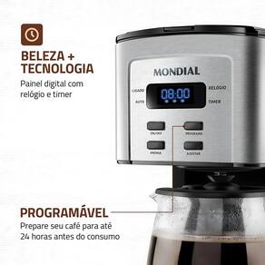 Mondial Cafeteira Elétrica Dolce Arome C-44-32X-SDI: Acorde para a Perfeição do Café Imagine começar o dia com o aroma inconfundível de um café recém-passado, quentinho e na medida certa, sem ter que levantar um dedo. A Cafeteira Elétrica Dolce Arome da Mondial transforma esse desejo em realidade. Combinando tecnologia de ponta, design elegante e funcionalidades pensadas para o seu dia a dia, ela é a escolha inteligente para quem valoriza praticidade e sabor em cada xícara. Disponível nas voltagens 110V e 220V, você pode escolher a opção ideal para sua casa. Prepare-se para elevar a sua experiência com café a um novo nível. Mondial, a Escolha Inteligente A Mondial é uma das marcas líderes no mercado de eletrodomésticos no Brasil, reconhecida por sua qualidade, inovação e compromisso em oferecer produtos que facilitam a vida de milhões de consumidores. Com uma trajetória consolidada, a marca se destaca pela durabilidade e eficiência de seus aparelhos, conquistando a confiança e a preferência de famílias em todo o país. Com um ano de em seus produtos, a Mondial reforça a sua promessa de excelência e satisfação. Funcionalidades e Benefícios que Encantam Programável em até 24 Horas: Esta é a funcionalidade estrela. O timer inteligente permite que você programe o preparo do café com até um dia de antecedência. Use a função programável para acordar com o aroma e o sabor de um café pronto. É o viés cognitivo do prazer antecipado em ação, transformando o produto em uma solução para um momento de prazer no futuro. Capacidade para até 32 Xícaras: Ideal para famílias grandes ou para quem adora receber visitas. Com uma jarra de 1,28 litros, a capacidade da Dolce Arome atende a todos, garantindo que ninguém fique sem sua dose de energia e sabor. Beleza e Tecnologia: O acabamento em aço escovado e o painel digital conferem um visual moderno e sofisticado, agregando valor estético à sua cozinha. O design elegante atrai o olhar e posiciona o produto como um item premium. Filtro Permanente e Ecológico: Diga adeus aos filtros de papel O filtro permanente com porta-filtro removível é uma solução sustentável e econômica. Além de reduzir o lixo, ele garante uma economia contínua, uma vez que não será necessário repor os filtros descartáveis. Essa característica apela para a consciência ambiental e para o senso de economia do consumidor. Jarra de Vidro de Alta Qualidade: A jarra de vidro é robusta, fácil de lavar e não retém resíduos ou odores, garantindo o sabor puro do café a cada preparo. A sua praticidade permite levá-la diretamente à mesa para servir. Sistema Corta-Pingos: Permite que você retire a jarra para servir uma xícara mesmo enquanto o café ainda está sendo passado, sem sujeira ou bagunça. Praticidade e conveniência são essenciais para a decisão de compra. Função Manter Aquecido: A base de aquecimento mantém o café quente por mais tempo, preservando seu sabor e aroma, sem queimar. Indicador de Nível de Água: Permite que você prepare a quantidade exata de café que precisa, evitando desperdício. Tampa Basculante: Facilita o processo de abastecer o reservatório de água e o porta-pó. A Escolha Inteligente para o seu Dia a Dia A Cafeteira Mondial Dolce Arome C-44-32X-SDI não é apenas um eletrodoméstico; é uma peça-chave para otimizar sua rotina e trazer mais conforto e sabor para o seu lar. Com a combinação de um design sofisticado e funcionalidades inteligentes, ela se destaca entre as demais. Não perca a chance de transformar suas manhãs e tardes. Adquira agora e descubra por que a Mondial é a escolha de milhões de consumidores. Ficha Técnica Completa: Marca: Mondial Modelo: C-44-32X-SDI Linha: Dolce Arome Digital Cor: Preto/Inox Tensão Voltagem : 110V ou 220V selecione a variação desejada Potência: 800W Capacidade: 32 Xícaras 1,28 Litros Material da Jarra: Vidro M