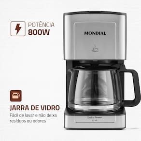A Cafeteira Elétrica Dolce Arome C-44-32X-SI da Mondial é a cafeteira que faltava na sua cozinha. Com design sofisticado em Aço Inox, ela tem capacidade para até 32 xícaras de café, sendo ideal para toda família. Conta com filtro permanente e porta-filtro removível que dispensa o uso de filtro de papel, sistema corta-pingos para servir o café durante o preparo, além de uma bela jarra de vidro. Aproveite a qualidade que só a Mondial tem a oferecer!
