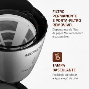 FILTRO PERMANENTE E PORTA-FILTRO REMOVÍVEL: A cafeteira dispensa a utilização do filtro de papel. Além de economizar, você ainda torna o seu dia a dia mais sustentável.