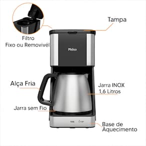 A Cafeteira Elétrica Philco PCF40C 1,6L é a solução ideal para quem ama praticidade e sabor na hora de preparar o café do dia a dia. Com capacidade para até 40 cafezinhos e design moderno em inox , ela combina eficiência, estilo e funcionalidade para oferecer a experiência perfeita, seja em casa ou no escritório.