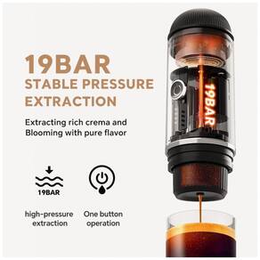 Além de sua eficiência, a máquina é uma opção sustentável e econômica, permitindo a preparação de café em qualquer lugar, seja em ambientes internos ou externos, ajudando a economizar e a reduzir o uso de copos plásticos. Seu design compacto e portátil facilita o transporte, e ela é compatível com café moído ou cápsulas de alumínio de marcas como Nespresso, Lor, Starbucks, Lavazza, Illy e outras.
