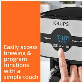 OPERAÇÃO DIGITAL Acesse facilmente as funções de preparo com um design digital de tela sensível ao toque e programação intuitiva PERFIL DE SABOR PERSONALIZADO Personalize ao seu gosto selecionando leve, médio e o e o Simply Brew ajustará os parâmetros de fabricação para fornecer sabores ideais para o perfil de sabor desejado DESIGN PERFEITO PARA FÁCIL PREPARAÇÃO Design simplista com todos os recursos que você precisa para preparar a melhor xícara de café com KRUPS. Janela de água transparente na lateral para encher facilmente o tanque e um painel digital simples para começar a preparar CONVENIENTE E SEGURANÇA A função manter quente é ativada automaticamente após a preparação para que você tenha café quente quando quiser e desliga automaticamente após 2 horas KEEPS TIME O painel frontal mostrará a hora atual depois que você acertar o relógio