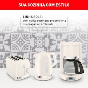 Cafeteira Elétrica Soleil Arno SFCM Marfim 127V Traga estilo e elegância para sua cozinha através da linha Soleil, que possui design retrô, decorando seu ambiente. A Cafeteira Arno Soleil é recomendada para aqueles que desejam maior conveniência e praticidade em seu dia a dia, aliado a segurança. Possui capacidade de 1,25L, visor lateral que facilita o enchimento do reservatório, juntamente com um porta-filtro giratório, que garante um acesso perfeito. Além disso, possui sistema corta pingos, que permite que você sirva uma xícara de café a qualquer momento durante o ciclo de preparação sem medo de pingar. Acompanha função de desligamento automático, após um ciclo de manutenção quente de 30 minutos, para total tranquilidade e segurança. Com Arno Soleil, tenha estilo também na sua cozinha!