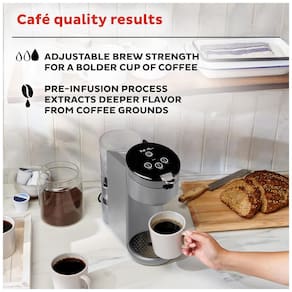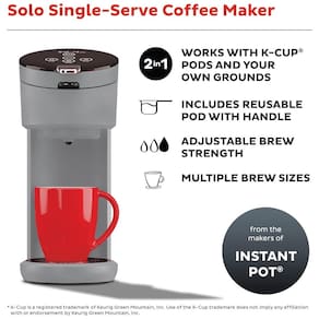 PROJETADO PARA CAFÉ MOÍDO Quando colocado no Instant Solo, nossa cápsula reutilizável especialmente projetada ativa um processo de fabricação exclusivo que extrai mais sabor, aroma e corpo do seu café moído favorito CICLO DE PRÉ INFUSÃO Embebe suavemente o pó em um K Cup ou na cápsula reutilizável antes de preparar para produzir uma xícara de café mais saborosa ADEQUAR CADA DEPOIMENTO Intensidade de infusão ajustável para que você possa fazer uma xícara de café mais ousada PREPARAÇÃO MAIS RÁPIDA Prepara uma única xícara em apenas 90 segundos VÁRIOS TAMANHOS DE CERVEJA Lida com vários tamanhos de cerveja xícara de 236, 295 e 354 mL FAÇA MAIS, RECARREGUE MENOS Reservatório removível grande de 1,1 litro DESIGN DE ECONOMIA DE ESPAÇO Cabe facilmente em uma bancada CANECA DE VIAGEM Adapta se a caneca de viagem de até de altura 473 mL com a bandeja de gotejamento removível INTERFACE AMIGÁVEL DO USUÁRIO Os botões do sensor de toque plano oferecem controle intuitivo fácil